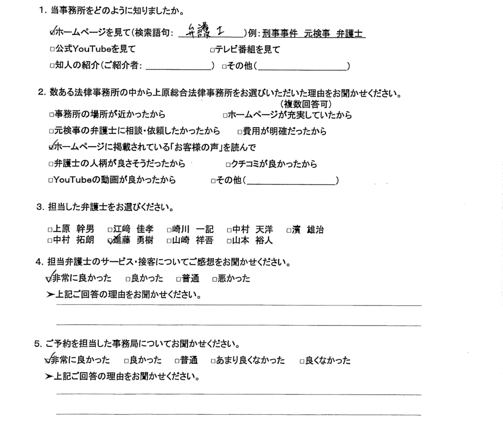 詳しくご事情を伺い、元検事としての経験を踏まえて、どのような処罰を受けることになるのかなどの見通しについてお話しさせていただきました。